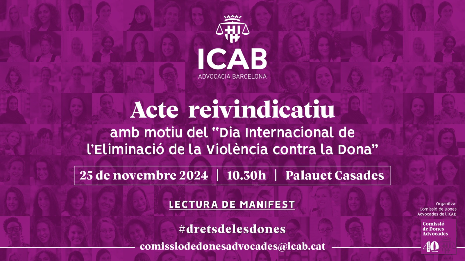 Amb motiu del Dia Internacional de l’Eliminació de la Violència Contra la Dona, el Col·legi de l’Advocacia de Barcelona (ICAB) realitzarà el pròxim dilluns, 25 de novembre de 2024, a les 10.30 h, un acte reivindicatiu per fer visible i denunciar la violència contra les dones i nenes.