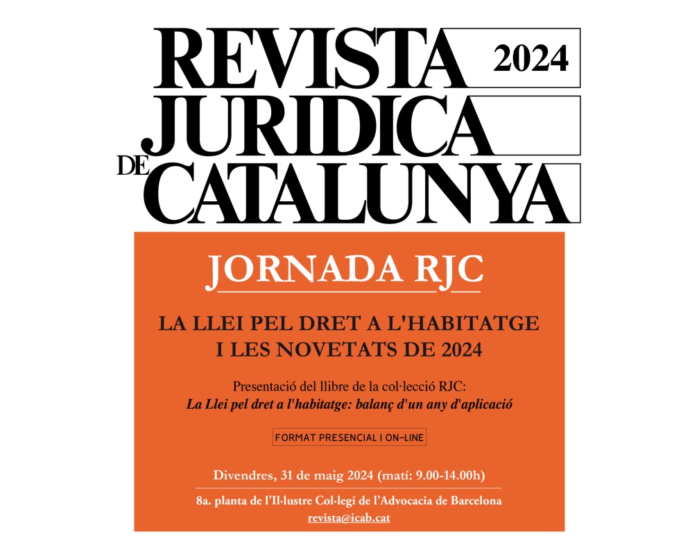 La Revista Jurídica de Catalunya (RJC), el Col·legi de l’Advocacia de Barcelona (ICAB) i l’Acadèmia de Jurisprudència i Legislació de Catalunya celebraran el proper divendres 31 de maig de 2014, de 9.15 a 14h, la Jornada “RJC 2024: La Llei pel dret a l'habitatge i les novetats de 2024”. La jornada es podrà seguir de forma presencial a la seu de l’ICAB i on-line.