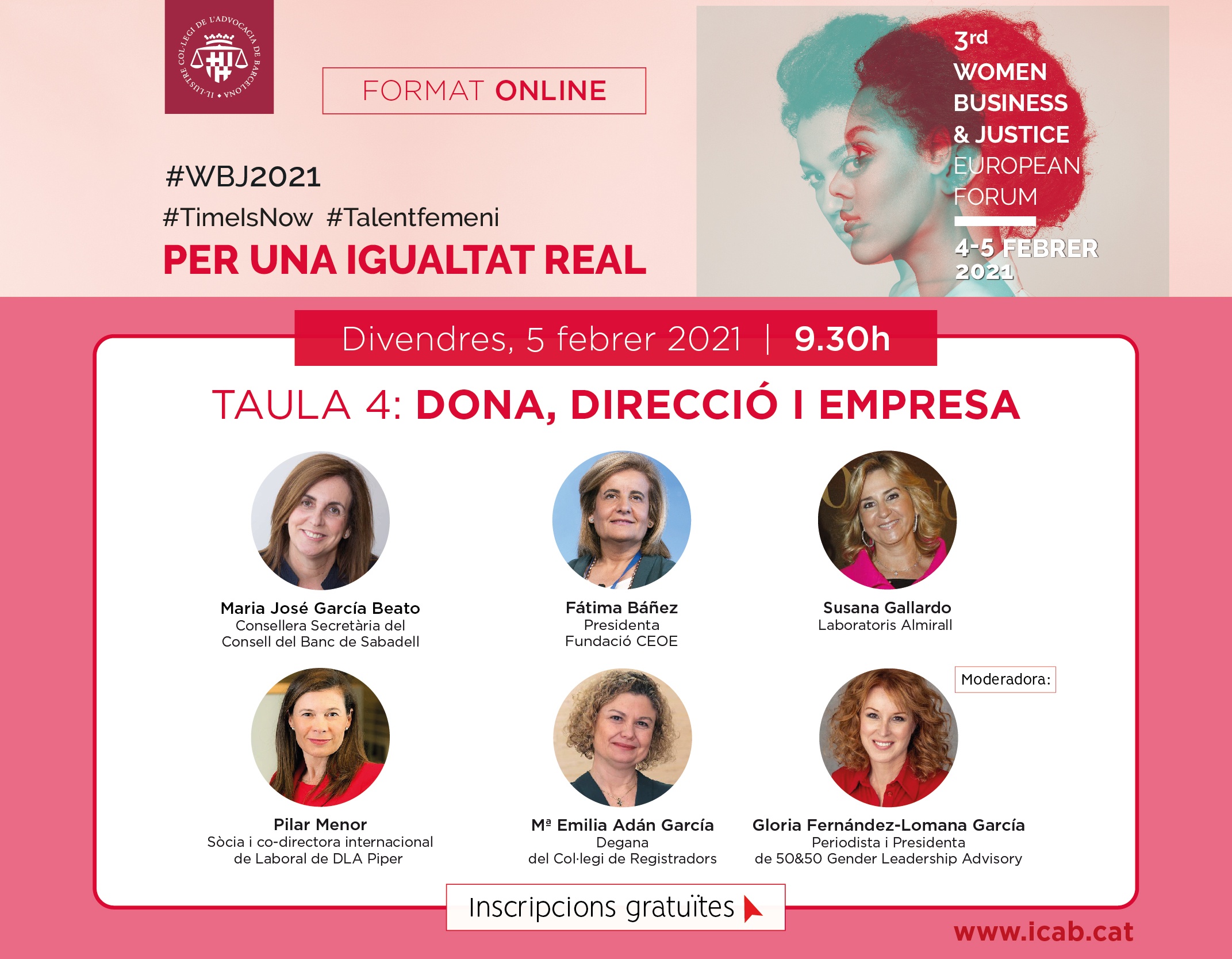 El divendres 5 de febrer de 2021, a les 09:30 hores, a través de la plataforma ZOOM, es durà a terme la 4a taula del 3rd Women Business & Justice European Forum, sota el títol ‘Dona, Direcció i Empresa’.