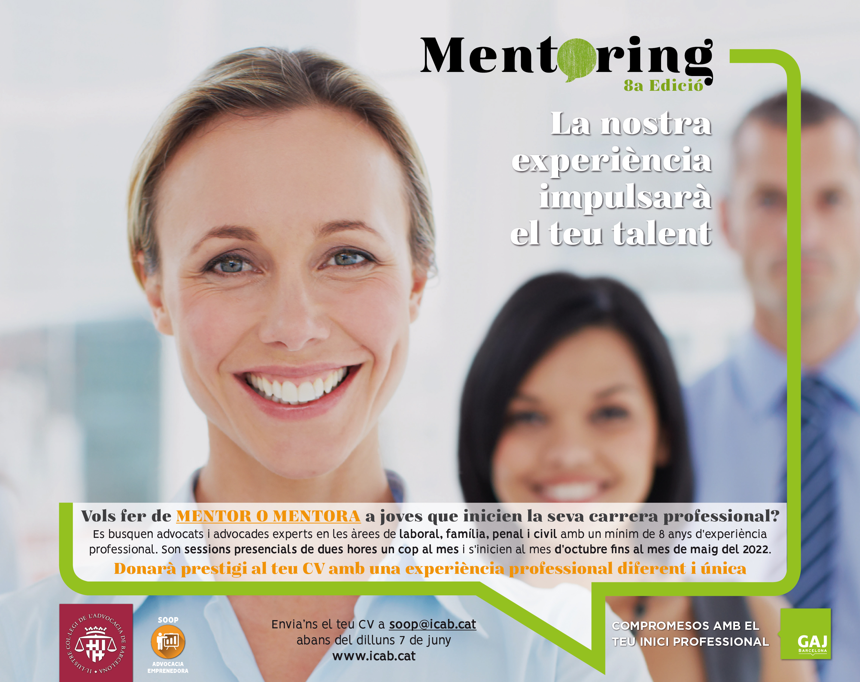 Totes les persones col·legiades exercents a l’ICAB que reuniu els requisits sol·licitats i que vulgueu compartir els vostres coneixements amb advocats/ades més joves, contacteu amb el Servei d’Ocupació i Orientació Professional soop@icab.cat i adjunteu el vostre CV, entrareu a formar part del procés de selecció. Termini de presentació de CV fins el 7 de juny de 2021.