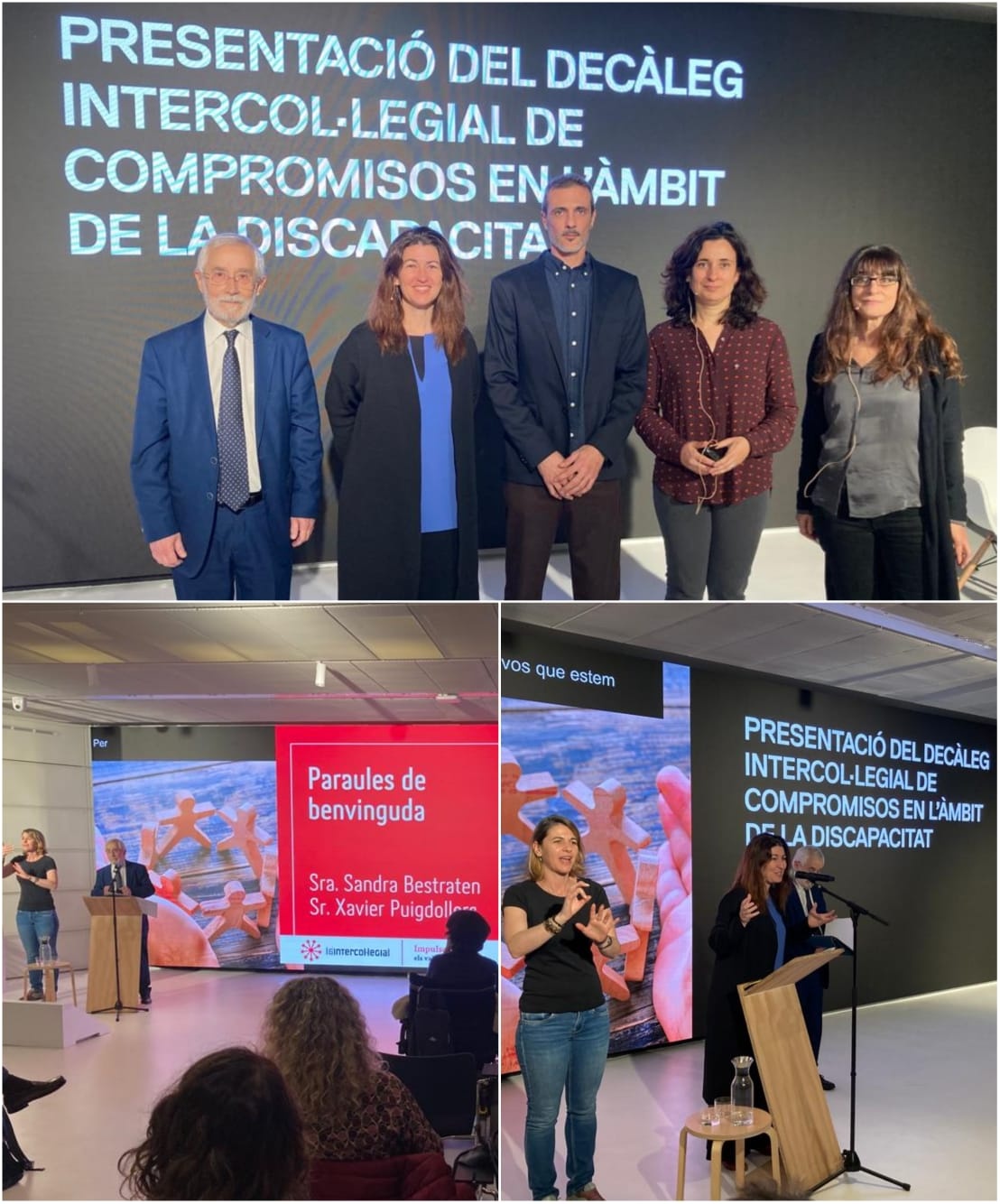 Barcelona, 29 de novembre del 2023. L’Associació Intercol∙legial, que representa més de 100 col∙legis professionals amb més de 250.000 col∙legiats/des de tots els àmbits professionals, ha presentat aquesta tarda, en el marc d’un acte celebrat a la seu del Col·legi d’Arquitectes de Catalunya, el “Decàleg Intercol·legial de compromisos en l’àmbit de la Discapacitat”.