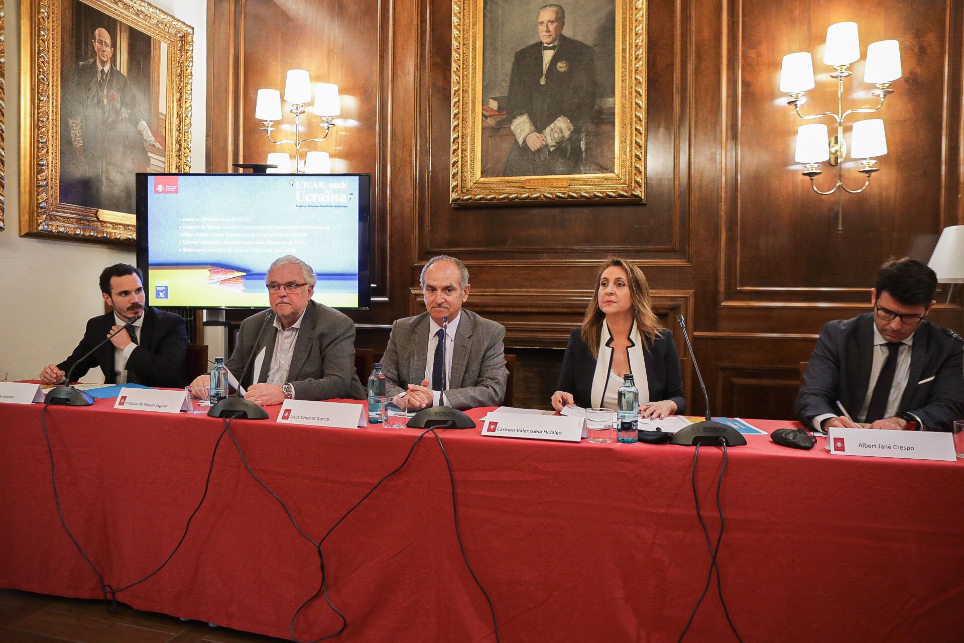 Barcelona, 4 de març de 2022. El degà del Col·legi de l’Advocacia de Barcelona, Jesús M. Sánchez; el diputat responsable de la Comissió de Justícia Penal Internacional, Albert Carles; la diputada responsable d’Estrangeria i del Torn d’Ofici, Carmen Valenzuela; el secretari i responsable del Departament d’Internacional de l’ICAB, Joaquim de Miquel; i el president del Grup de l’Advocacia Jove de la Corporació, Albert Jané, han donat a conèixer les funcionalitats i casuístiques del projecte “UKRAINIAN POPULATION ASSISTANCE”.
