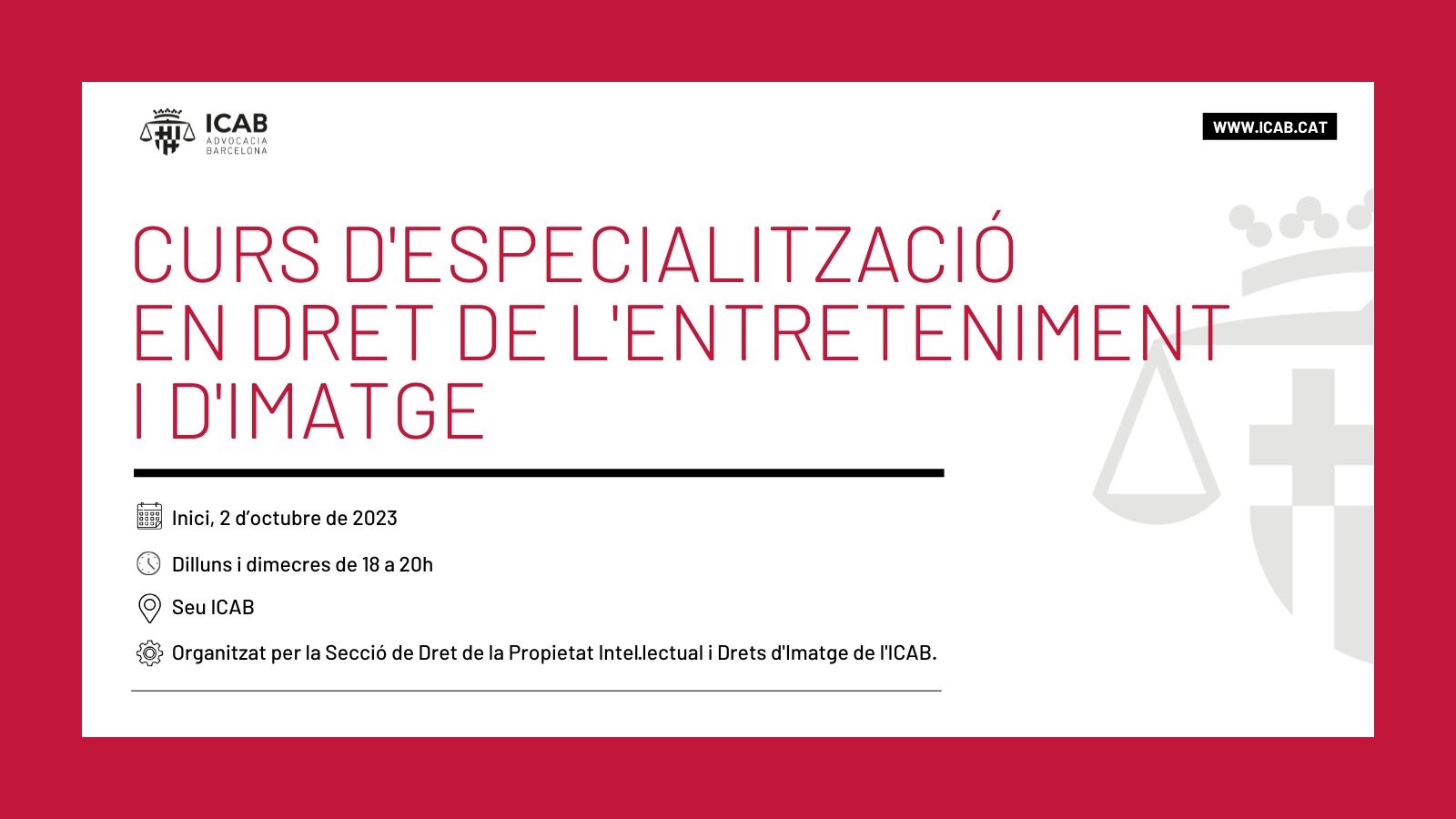 La Secció de Drets de Propietat Intel·lectual i Drets d’Imatge de l’Il·lustre Col·legi de l’Advocacia de Barcelona (ICAB) obre la matrícula per al Curs d’especialització en Dret de l’Entreteniment i d’Imatge, que tindrà lloc al Centre de Formació de l’ICAB (Mallorca, 281) a partir de l'octubre 2023.