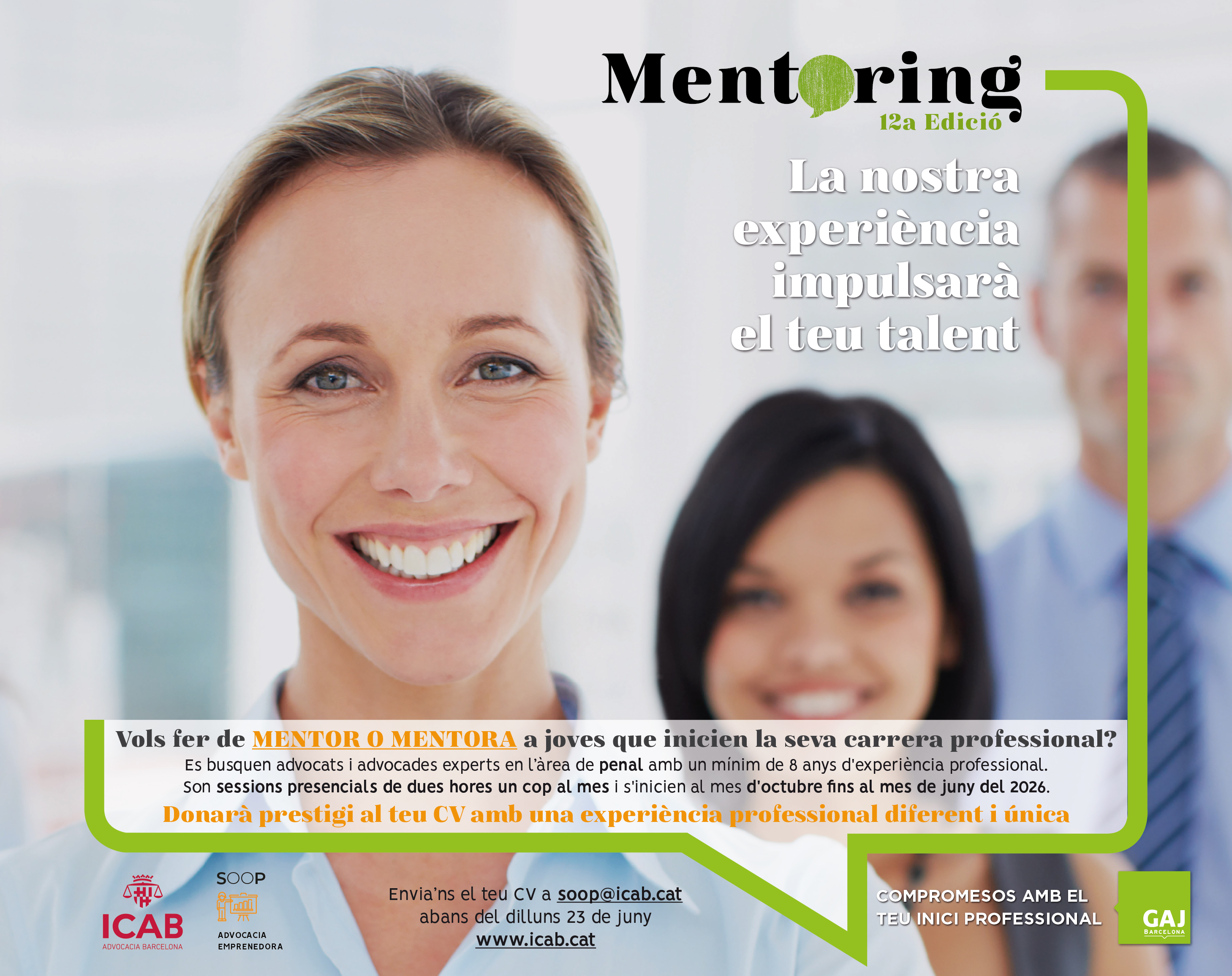 El MENTORING és una iniciativa que té com a finalitat donar suport als joves advocats i advocades que s’inicien en l’exercici de l’advocacia. El termini de presentació de CV és fins al 23 de juny de 2025.
