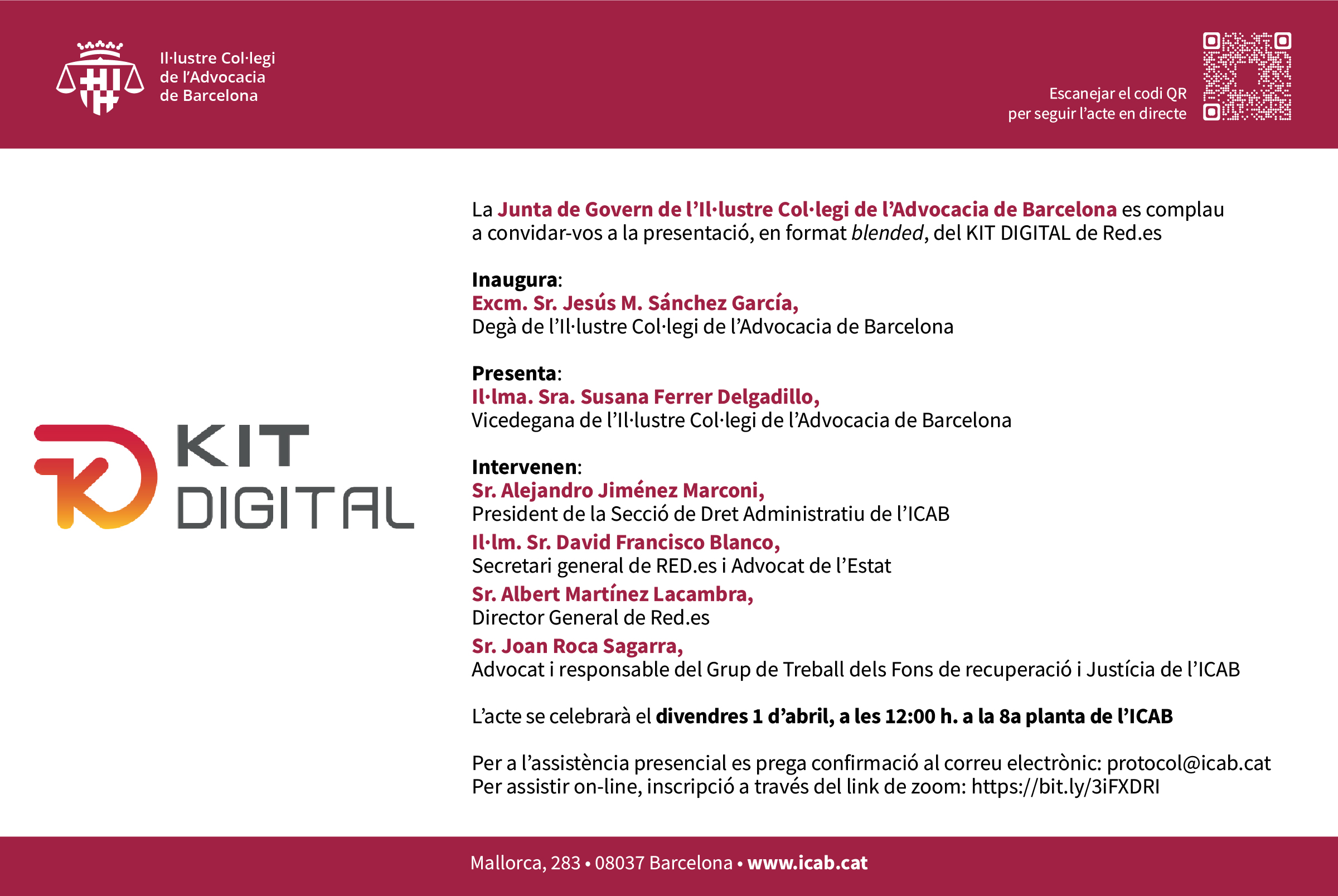 NOTA DE PREMSA: Red.es presenta a l'ICAB el 'Kit Digital', un programa d'ajuts amb què autònoms i pimes del sector jurídic podran promoure la seva transformació digital