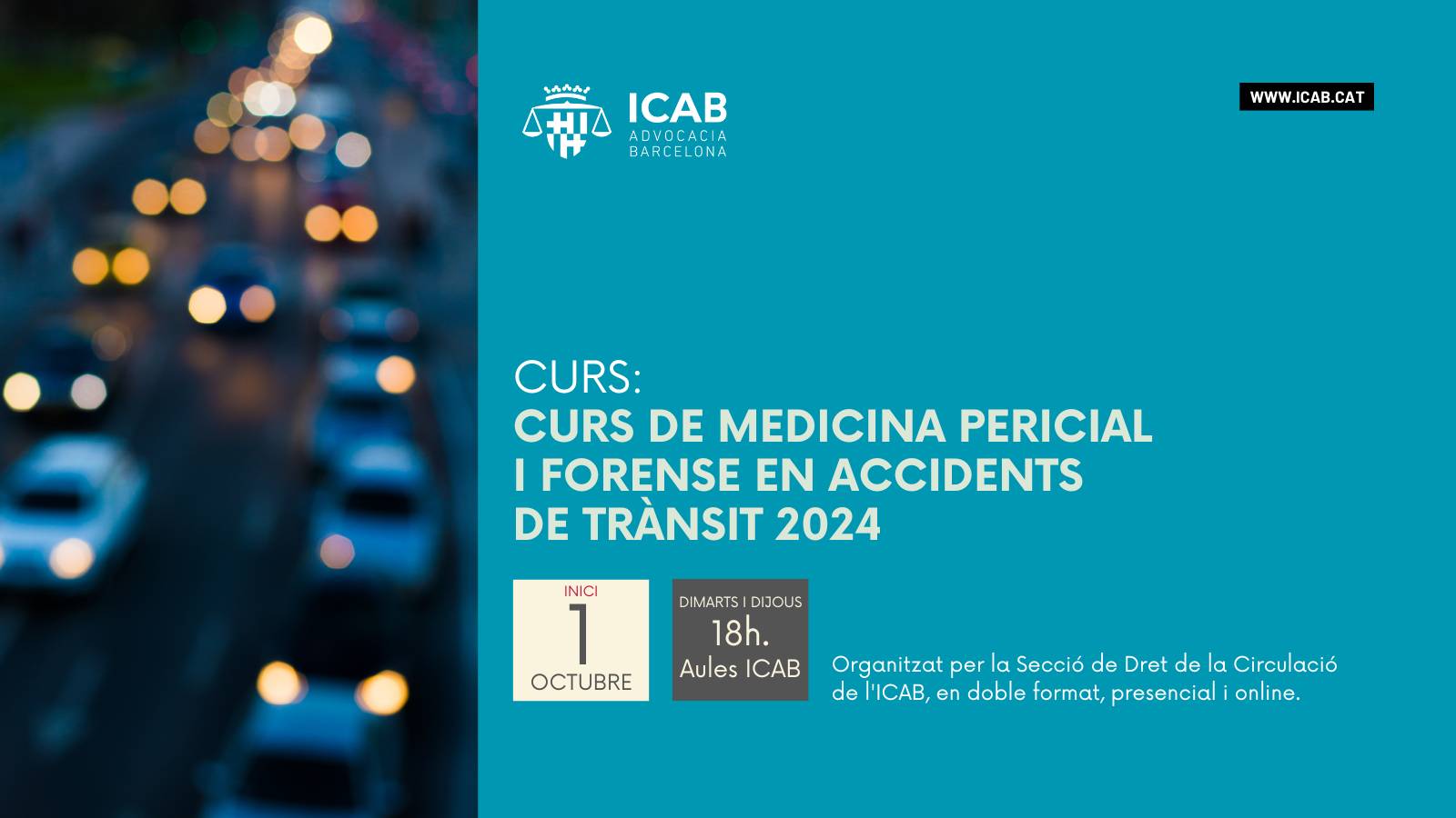 Inici: 01/10/2024. Organitzat per la Secció de Dret de la Circulació de l'ICAB, en doble format, presencial i online.