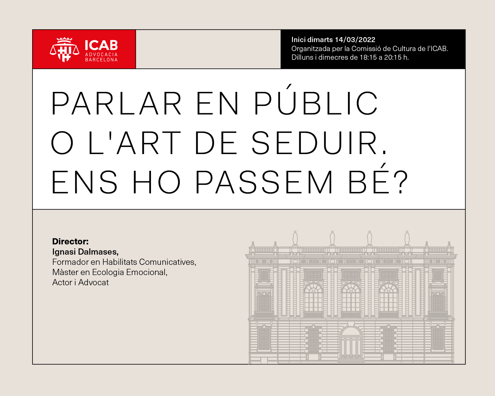 Inici: 13/02/2023. Director: Ignasi Dalmases. Formador en Habilitats Comunicatives, Màster en Ecologia Emocional, Actor i Advocat