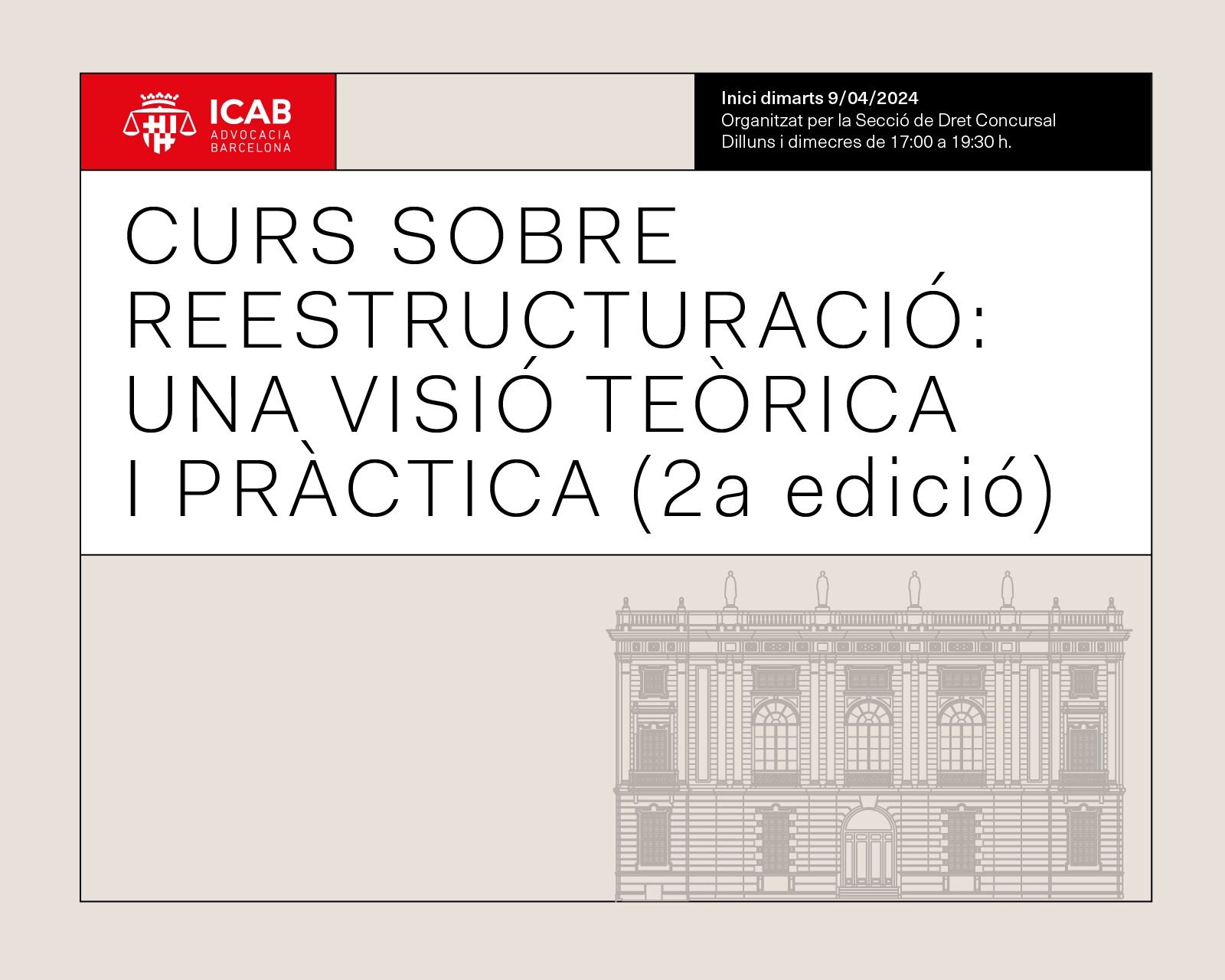 Inici: 09/04/2024, a les 17h, a la 8a planta ICAB. Organitzat per la Secció de Dret Concursal de l'Il·lustre Col·legi de l'Advocacia de Barcelona.