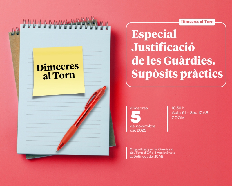 Tindrà lloc el dia 5 de novembre de 2025, a les 18.30 h. Organitzat per la Comissió de Torn d'Ofici i Assistència a la Persona Detinguda de l'ICAB en doble format (presencial i en línia).