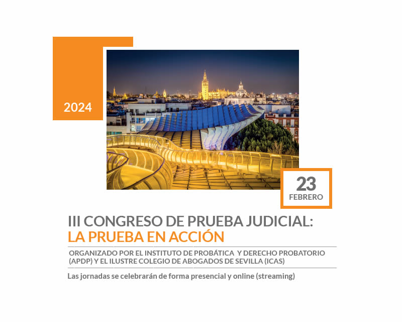 23 de febrer del 2024. Organitzat per l'Institut de Probàtica i Dret Probatori (APD) i l'Il·lustre Col·legi d'Advocats de Sevilla (ICAS). Format blended. Les jornades se celebraran de manera presencial i on-line (streaming).