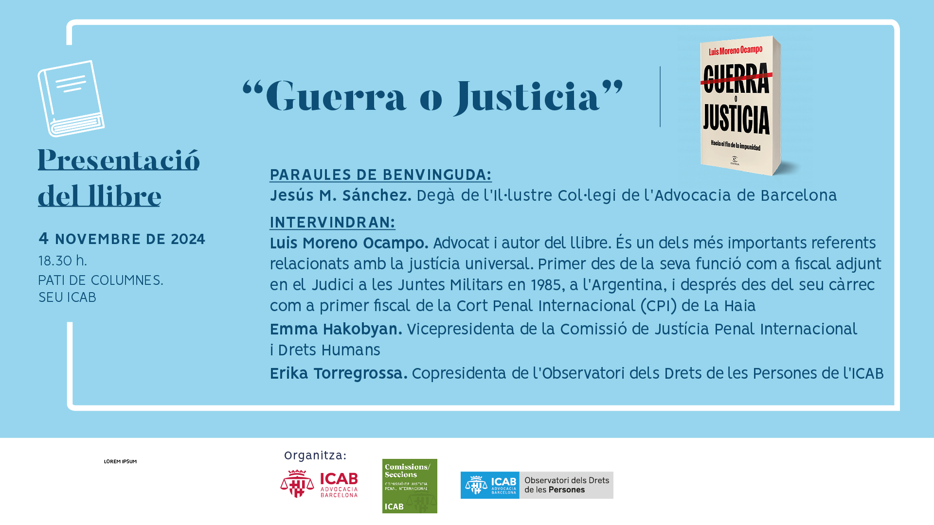 El dia 4 de novembre de 2024, a les 18.30h al Pati de Columnes, tindrà lloc la presentació del llibre “Guerra o Justicia”, de Luis Moreno Ocampo. Organitza: Comissió de Justícia Penal Internacional i Drets Humans i Observatori dels Drets de les Persones de l'ICAB.