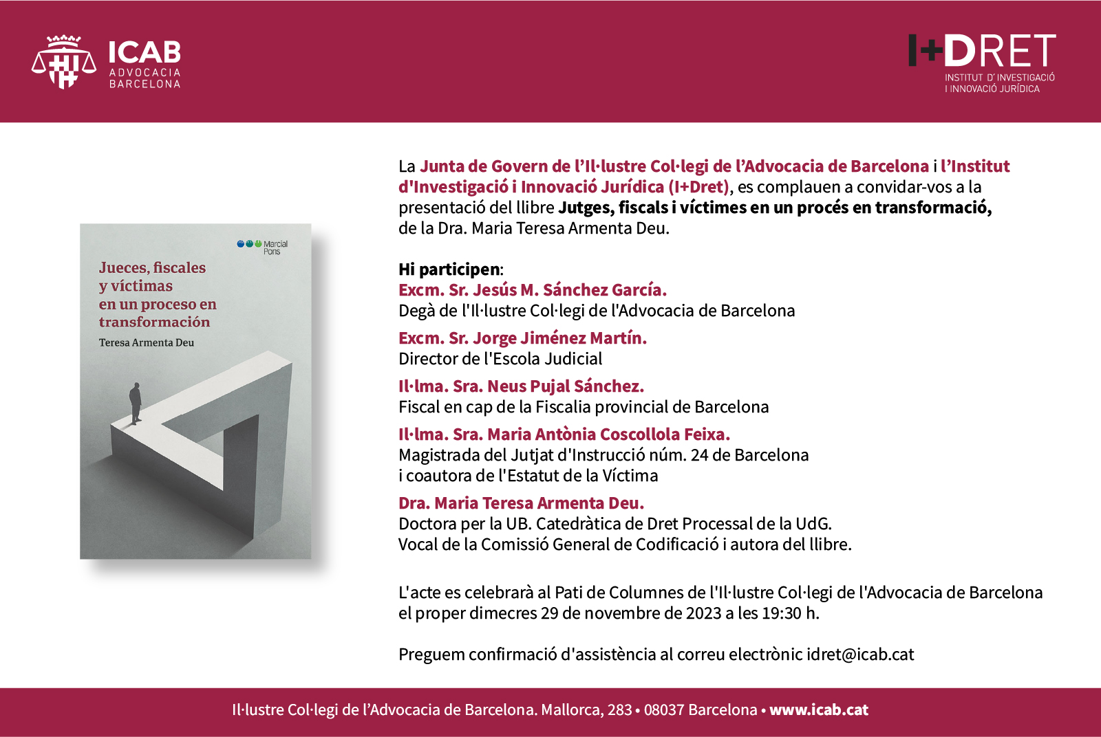L'acte se celebrarà al Pati de Columnes de l'Il·lustre Col·legi de l'Advocacia de Barcelona.