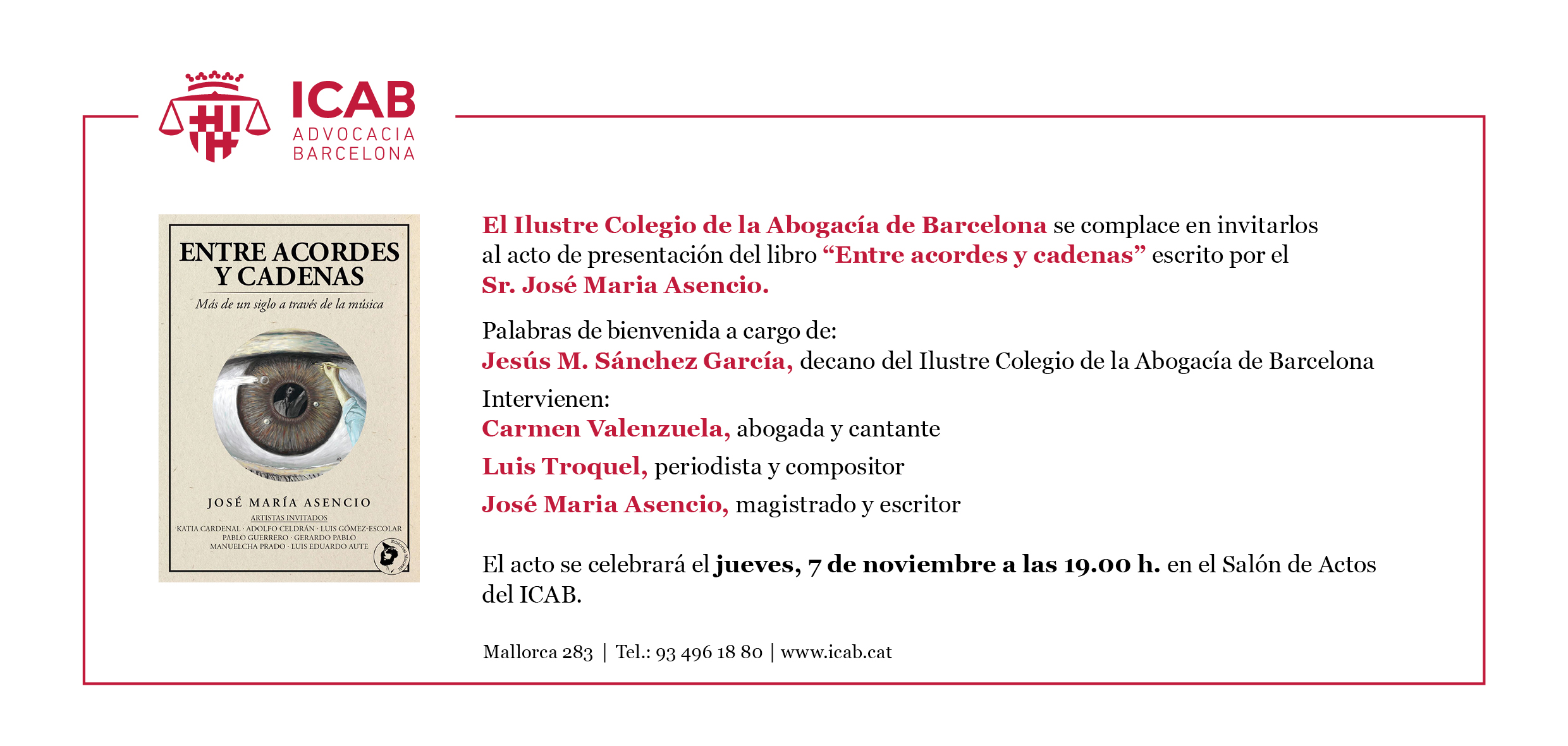 El Ilustre Colegio de la Abogacía de Barcelona acoge el acto de presentación del libro “Entre Acordes y Cadenas", escrito por el Sr. José Maria Asencio.