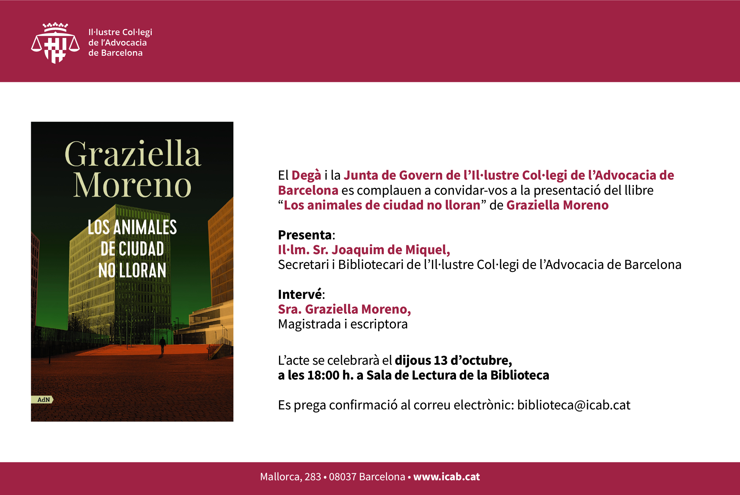 Se ruega confirmación al correo electrónico: biblioteca@icab.cat