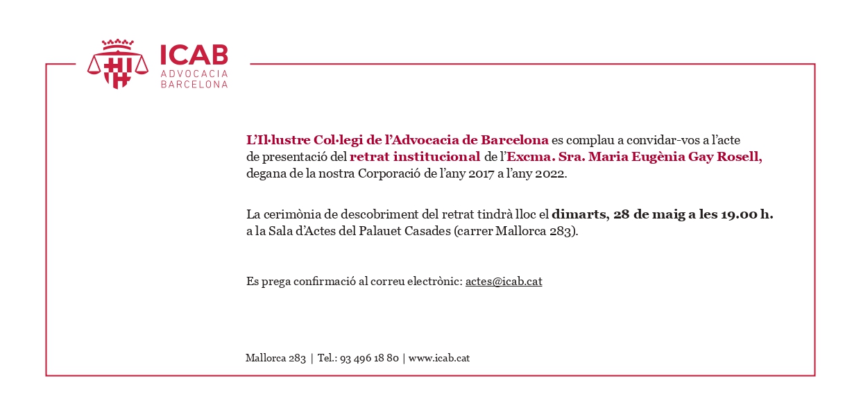 La ceremonia de descubrimiento del retrato tendrá lugar el martes, 28 de mayo a las 19:00 h. en el Salón de Actos del Palauet Casades (calle Mallorca 283).