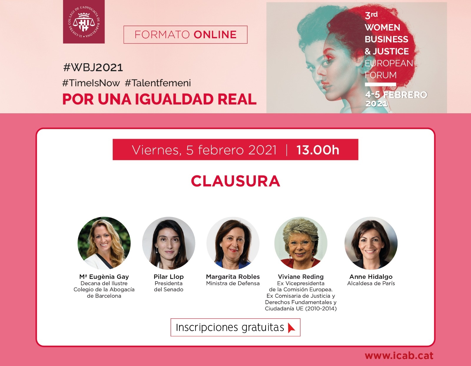 En esta sesión on-line participarán Mª Eugenia Gay, decana del Colegio de la Abogacía de Barcelona; Pilar Llop, presidenta del Senado; Margarita Robles Fernández, ministra de Defensa; y Viviane Reading, ex vicepresidenta de la Comisión Europea y ex comisaria de Justicia y Derechos Fundamentales y Ciudadanía UE (2010-2014) y Anne Hidalgo, alcaldesa de París.