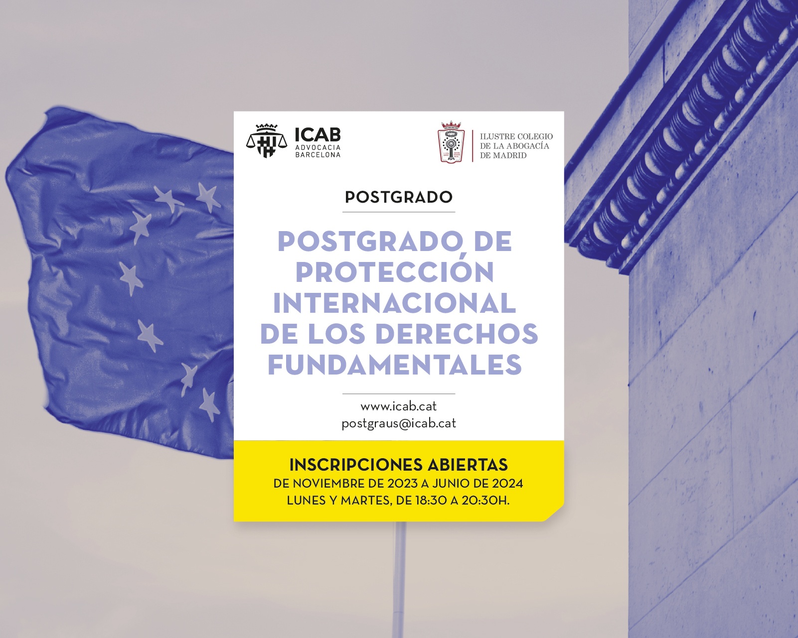 El Ilustre Colegio de la Abogacía de Barcelona (ICAB), con la colaboración del ICAM, pondrá en marcha en noviembre la primera edición del Postgrado de Protección Internacional de los Derechos Fundamentales con el objetivo de impulsar la carrera profesional de los colegiados y colegiadas a nivel internacional. ¡Matrícula abierta!