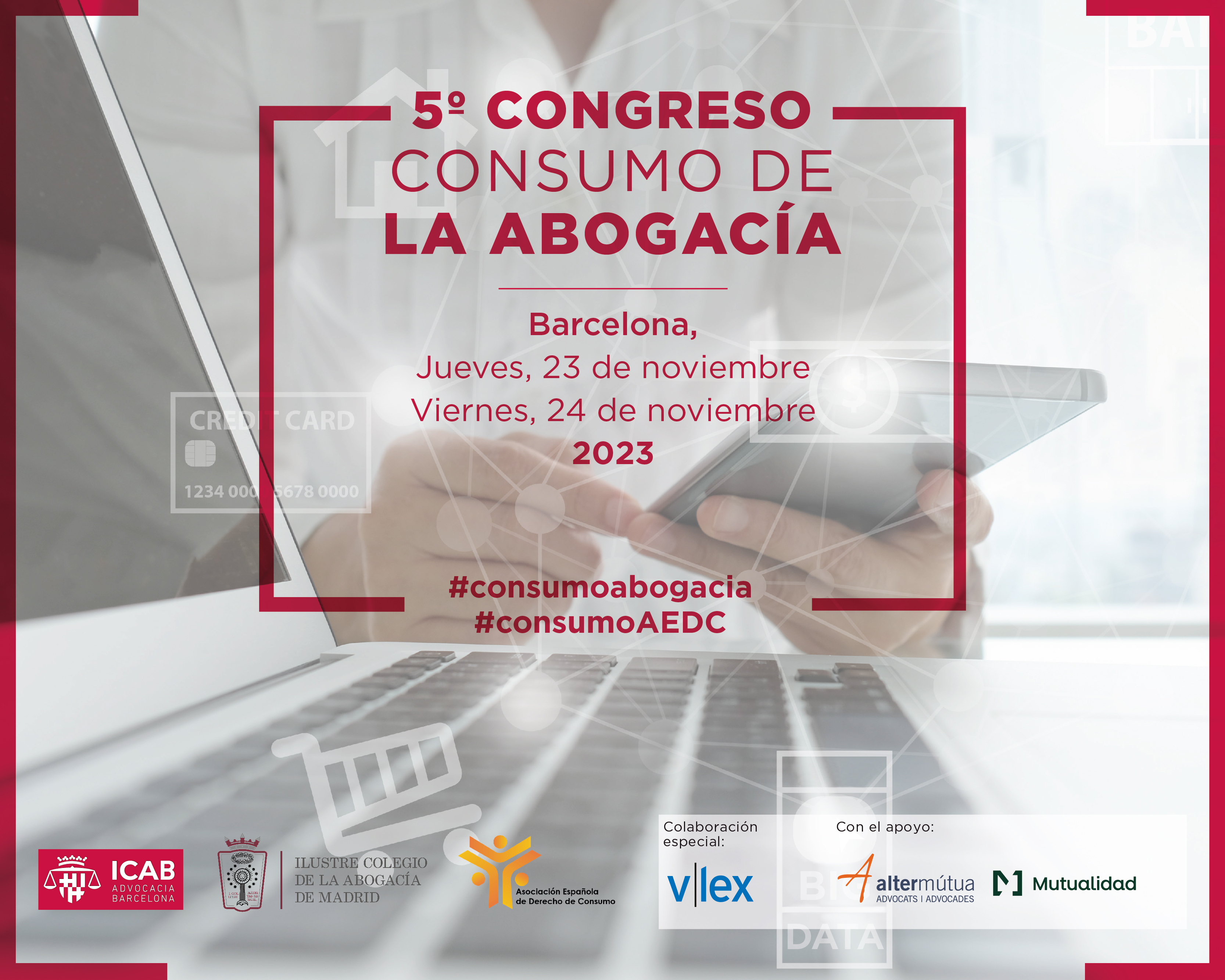 Los Colegios de la Abogacía de Barcelona (ICAB) y de Madrid (ICAM) y la Asociación Española de Derecho de Consumo (AEDC) organizan el V Congreso de Consumo de la Abogacía, que tendrá lugar los días 23 y 24 de noviembre en el Palauet Casades, sede de la abogacía barcelonesa.