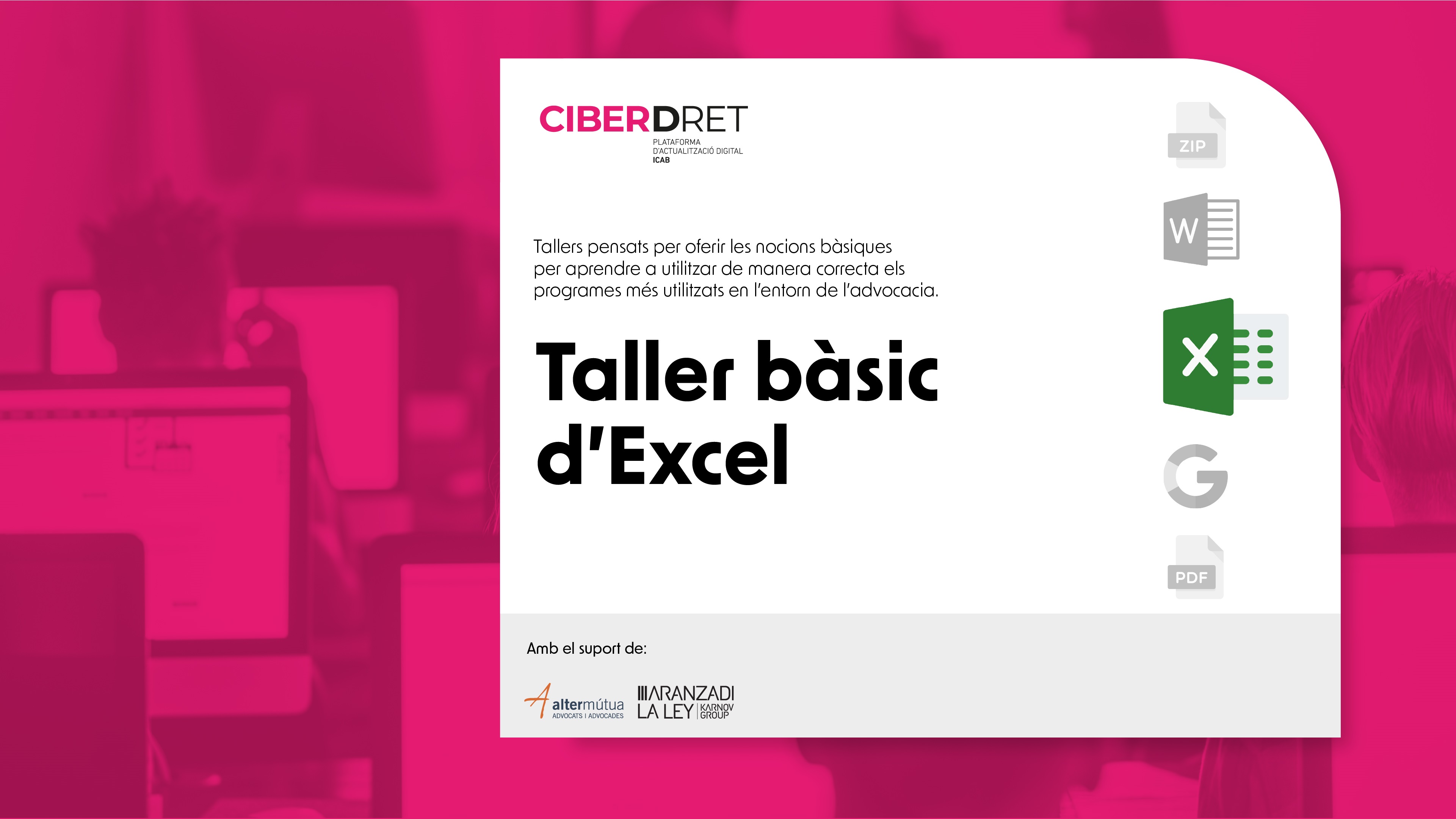 Desde CIBERDRET hemos organizado este taller con la finalidad de poder ofrecer a todas las personas colegiadas del Colegio de la Abogacía de Barcelona (ICAB) las herramientas para aprender a usar de una forma eficiente el programa MICROSOFT EXCEL. La duración es de 1 sesión que se impartirá el día 13 de diciembre de 2024.
