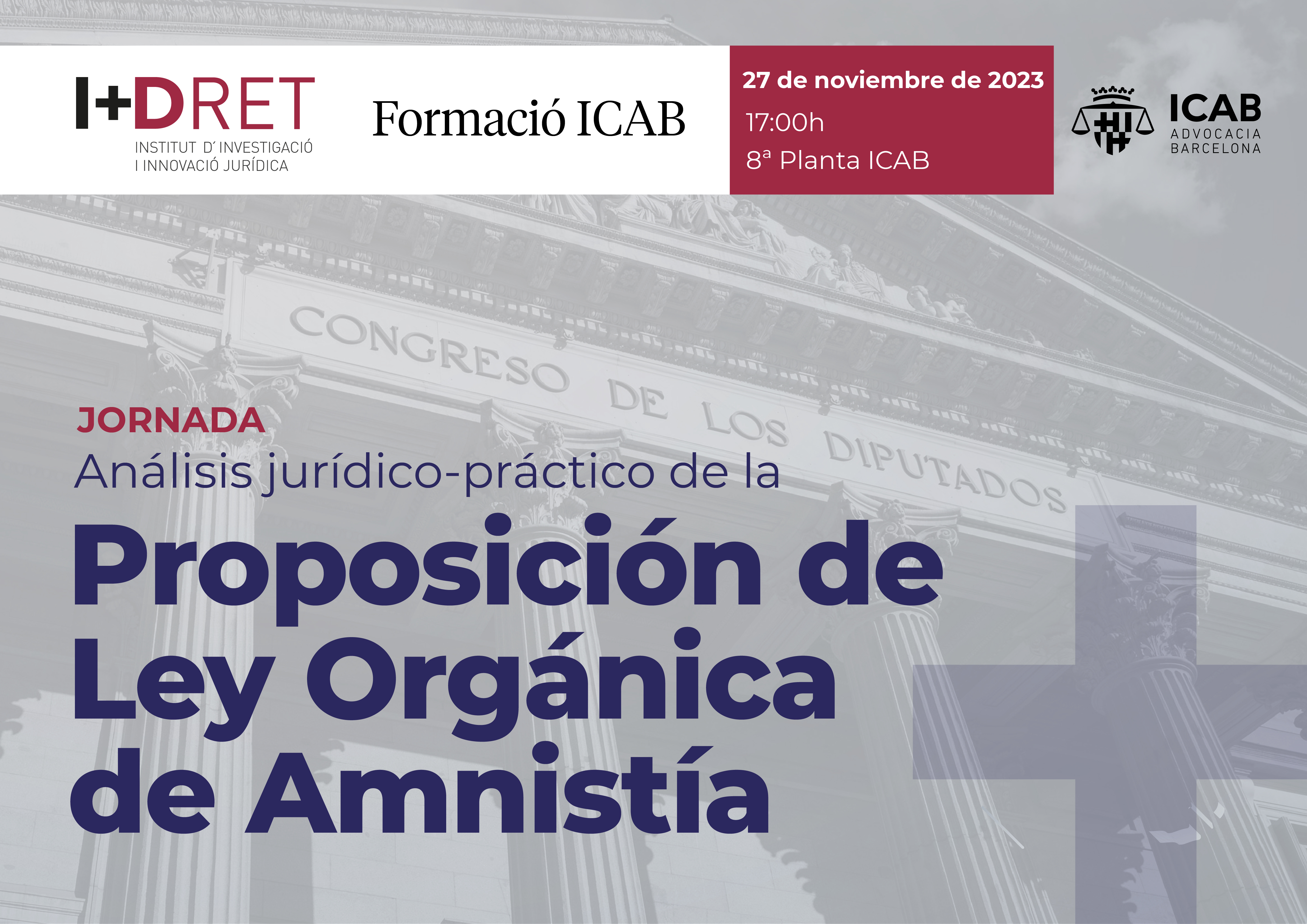 Prosiguiendo con el conjunto de conferencias y jornadas formativas sobre temáticas de plena actualidad jurídica, el Ilustre Colegio de la Abogacía de Barcelona (ICAB), a través del Instituto I+DRET y Formación ICAB, organiza esta jornada sobre el Análisis práctico-jurídico de la Proposición de Ley Orgánica de Amnistía, desde la convicción de que es necesario preservar la división de poderes y garantizar la igualdad en la aplicación de la ley y la independencia judicial.