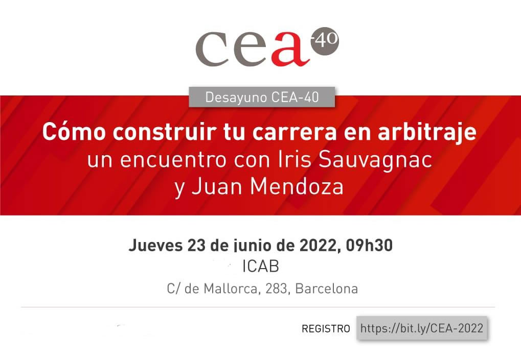 Desayuno CEA-40: "Cómo construir tu carrera en arbitraje. Un encuentro con Iris Sauvagnac y Juan Mendoza" - PLAZAS AGOTADAS