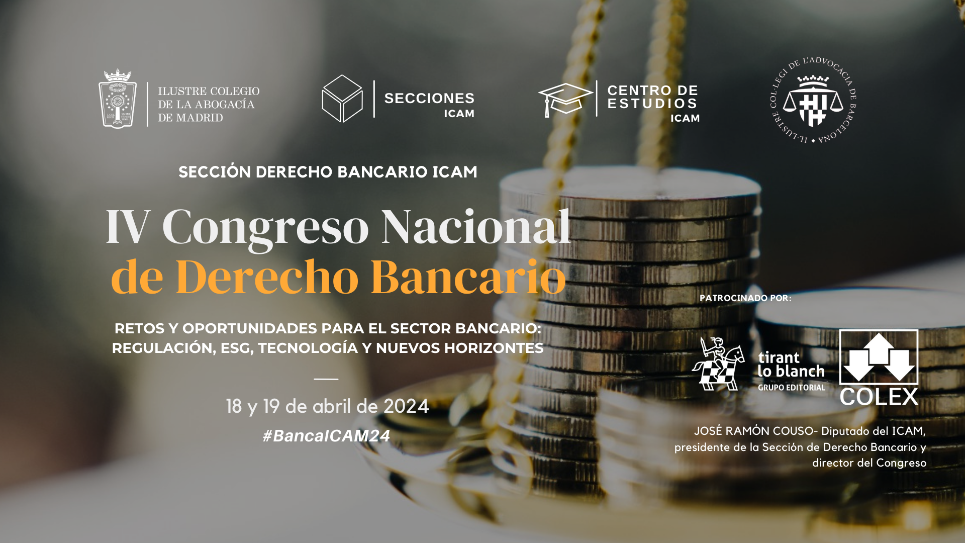 Los próximos días 18 y 19 de abril de 2024, el Ilustre Colegio de la Abogacía de Madrid celebrará su IV Congreso Nacional de Derecho Bancario, organizado por la Sección de Derecho Bancario del ICAM con la colaboración del Ilustre Colegio de la Abogacía de Barcelona (ICAB) y con el patrocinio de Tirant lo Blanch y de la editorial COLEX.