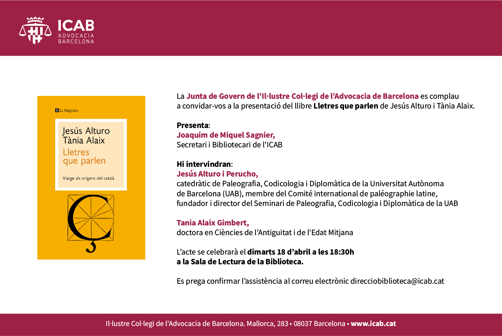 El 18 de abril de 2023, a las 18.30h, tendrá lugar en la Sala de Lectura de la Biblioteca del Ilustre Colegio de la Abogacía de Barcelona (ICAB) la presentación del libro "Lletres que parlen", de Jesús Alturo y Tania Alaix (editorial La Magrana, febrero 2023).