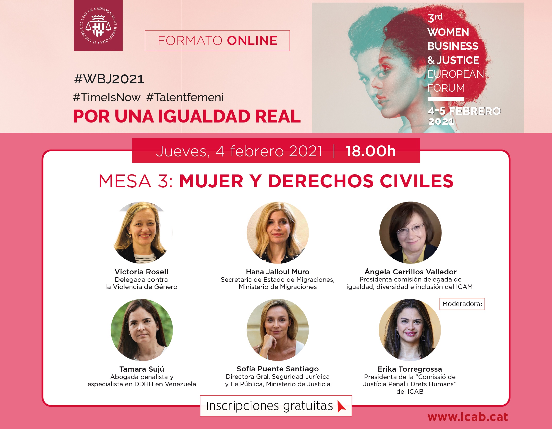 El jueves 4 de febrero de 2021, a las 18:00 horas, por ZOOM, tendrá lugar la 3ª mesa del 3rd Women Business & Justice European Forum, bajo el título 'Mujer y Derechos Civiles'.