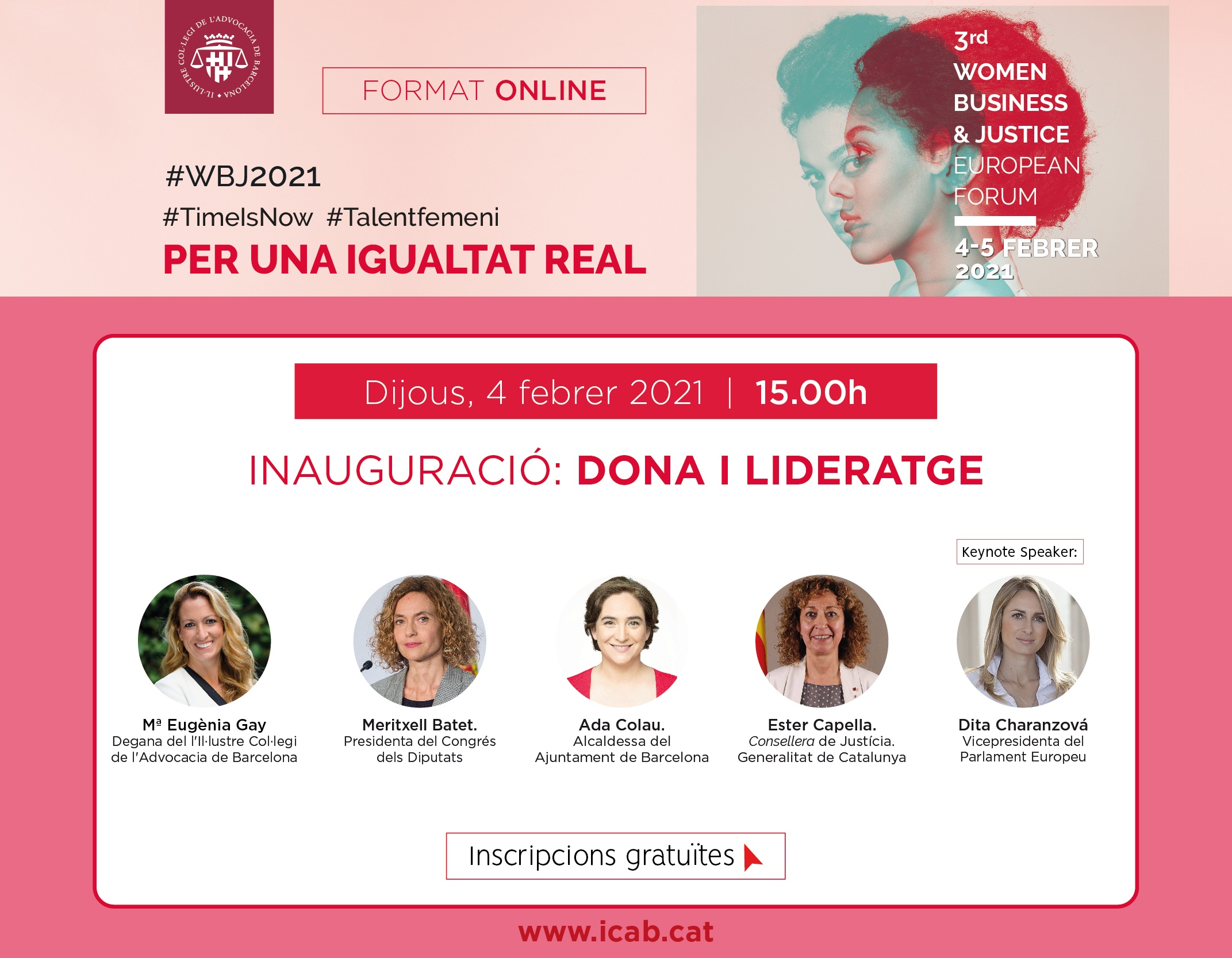 El jueves 4 de febrero de 2021, a las 15h, se inaugurará el 3rd Women Business & Justice European Forum con una videoconferencia por ZOOM.