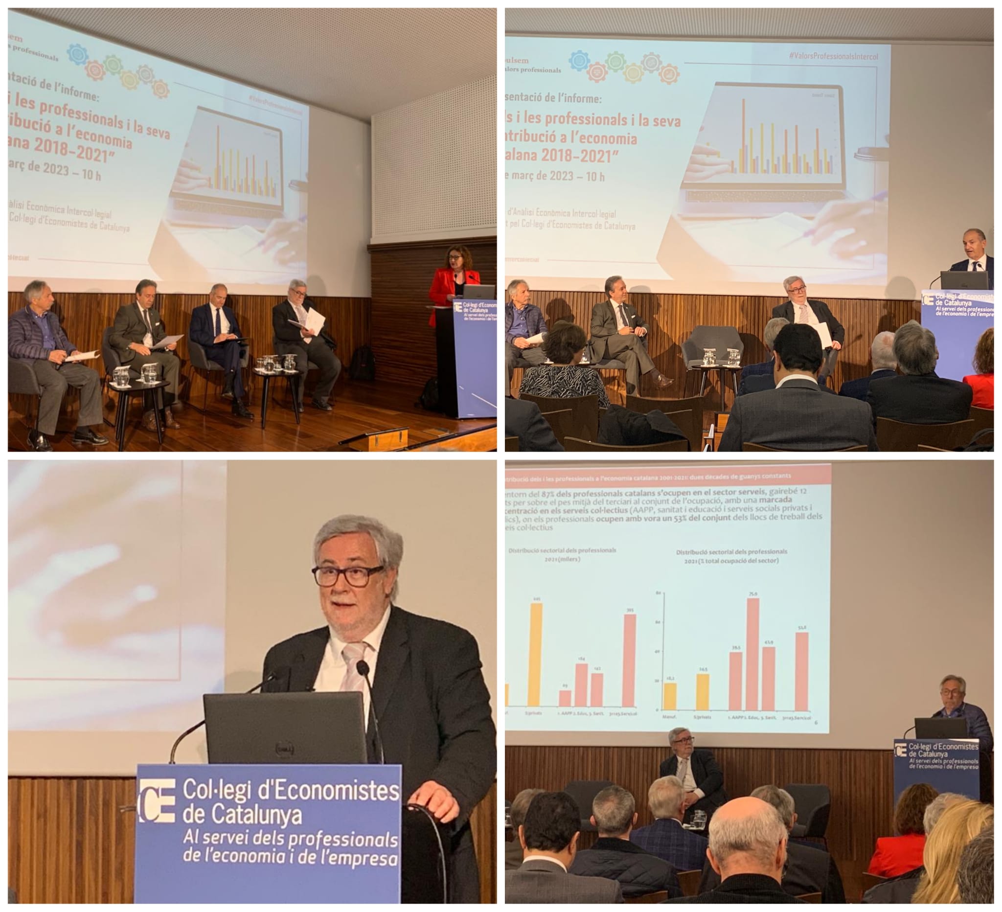 L’Associació Intercol·legial de Col·legis Professionals de Catalunya - que representa a más de 100 colegios profesionales con más de 250.000 colegiados/as de todos los ámbitos profesionales – ha presentado esta mañana el informe "Los y las profesionales y su contribución a la economía catalana 2018-2021" fruto del impulso del Centre d’Anàlisi Econòmica Intercol·legial presidida por el Col·legi d’Economistes de Catalunya. El estudio, elaborado por los economistas Josep Oliver Alonso y Xavier Segura Porta, tiene por objetivo estimar la contribución de los profesionales a la economía catalana en el período 2018-2021. Tal y como han destacado los autores durante la presentación, “el análisis toma especial relevancia a la vista de las nuevas condiciones generadas por la Covid-19 y la guerra en Ucrania que plantean la necesidad imperiosa de obtener aumentos de productividad, objetivo para al cual el papel de los profesionales es decisivo y para el que también cabe esperar impactos positivos de los fondos europeos Next Generation”. Según Oliver i Segura, “las circunstancias adversas que han afectado en los últimos años a la economía catalana han exigido actuaciones compensatorias por parte del sector público que en muchos casos se han centrado en ámbitos como los de la sanidad y educación, ámbitos en que los y las profesionales tienen una particular presencia”.