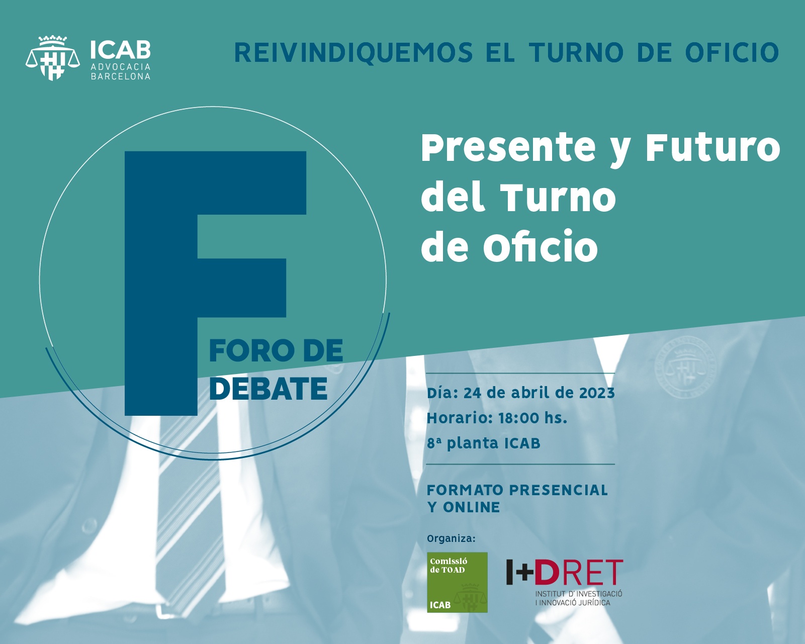 Con el ánimo de contribuir desde la abogacía institucional al necesario debate sobre el futuro del Turno de Oficio y la Justicia Gratuita, el Ilustre Colegio de la Abogacía de Barcelona (ICAB) acoge el 24 de abril de 2023, a las 18h, este foro organizado por la Comisión del Turno de Oficio y Asistencia a la Persona Detenida y el Instituto I+DRET.