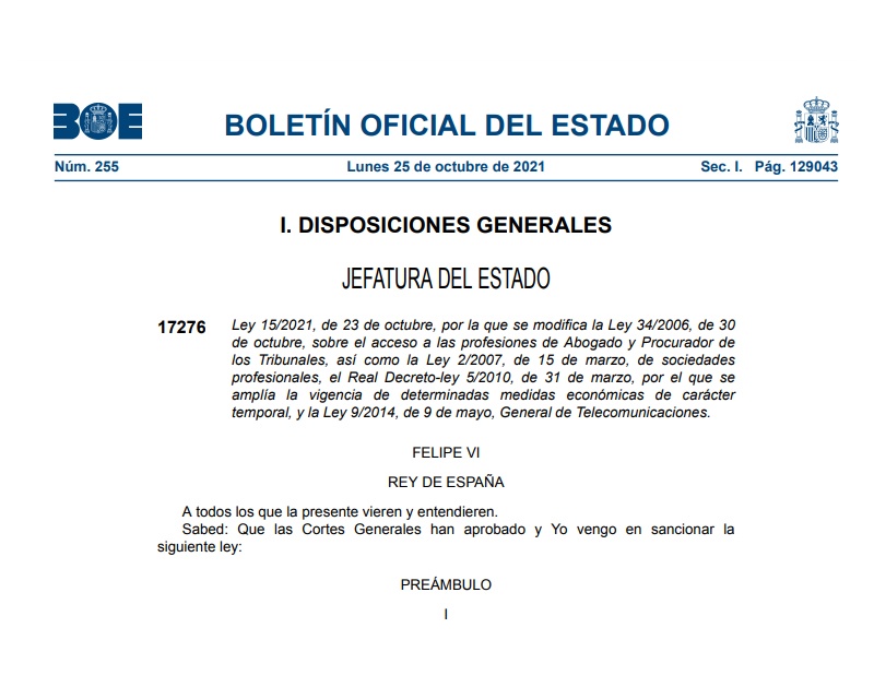 El BOE del 25 de octubre de 2021 ha publicado la “Ley 15/2021, de 23 de octubre, por la que se modifica la Ley 34/2006, de 30 de octubre, sobre el acceso a las profesiones de Abogado y Procurador de los Tribunales, así como la Ley 2/2007, de 15 de marzo, de sociedades profesionales, el Real Decreto-ley 5/2010, de 31 de marzo, por el que se amplía la vigencia de determinadas medidas económicas de carácter temporal, y la Ley 9/2014, de 9 de mayo, General de Telecomunicaciones”