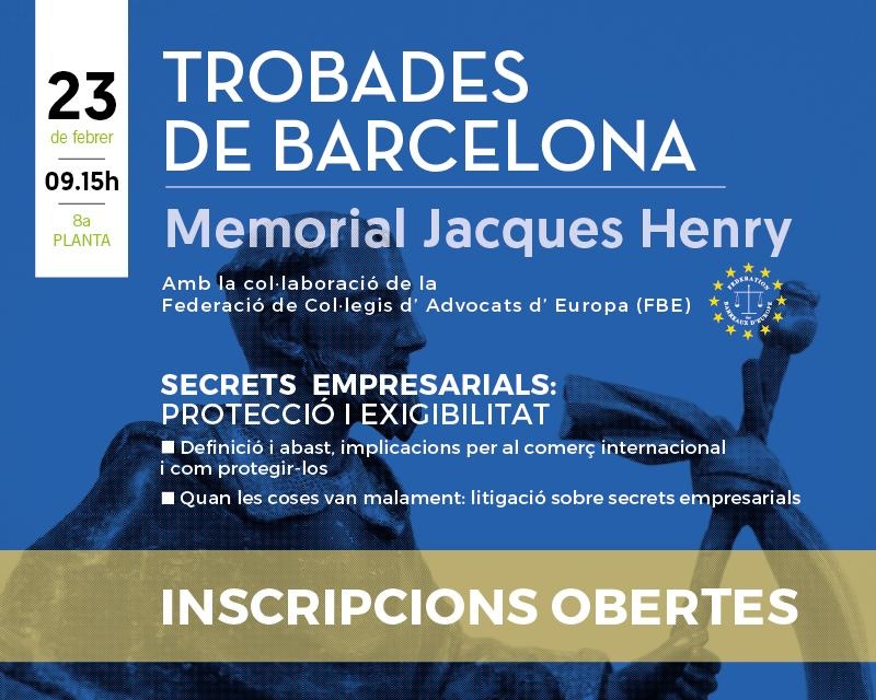 El Colegio de la Abogacía de Barcelona, con la colaboración de la FBE (Fédération des Barreaux d’Europe), organiza el viernes 23 de febrero de 2018 por la mañana la celebración de los Encuentros de Barcelona-Memorial Jacques Henry. En esta ocasión, los Encuentros se centrarán en el tema de los 'Secretos empresariales: protección y exigibilidad'.