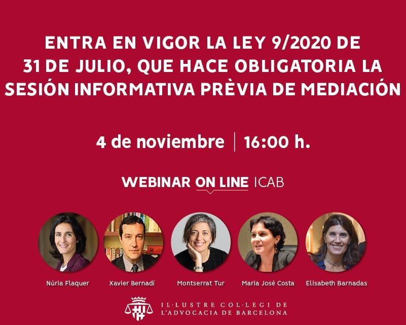 Webinar: 'Entra en vigor la Ley 9/2020 de 31 de julio, que hace obligatoria la sesión informativa prèvia de Mediación'