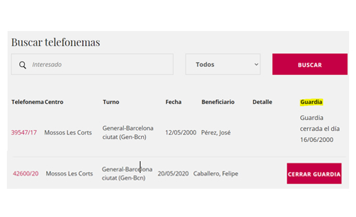 1. Desde el buscador de telefonemas y designas, también aparecerá (al lado derecho) la opción de "Cerrar guardia" en telefonemas y designas asociadas a una guardia aún no cerrada.