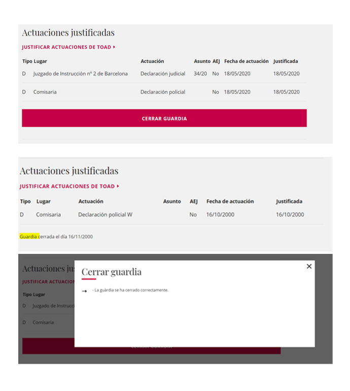 Si realizáis la justificación y comunicación de haber realizado la justificación de todas las actuaciones de la guardia a través del registro del ICAB, junto con los justificantes de las actuaciones correspondientes a la guardia, deberéis adjuntar en primer lugar el formulario (que podéis encontrar en vuestra Área Personal y también en los correspondientes registros del ICAB) por el que comunicáis presentar todas las actuaciones del día de la guardia y que no hay otra actuación de ese día para justificar. Este formulario se deberá adjuntar siempre como primera hoja, uniendo detrás el resto de justificantes de la guardia.