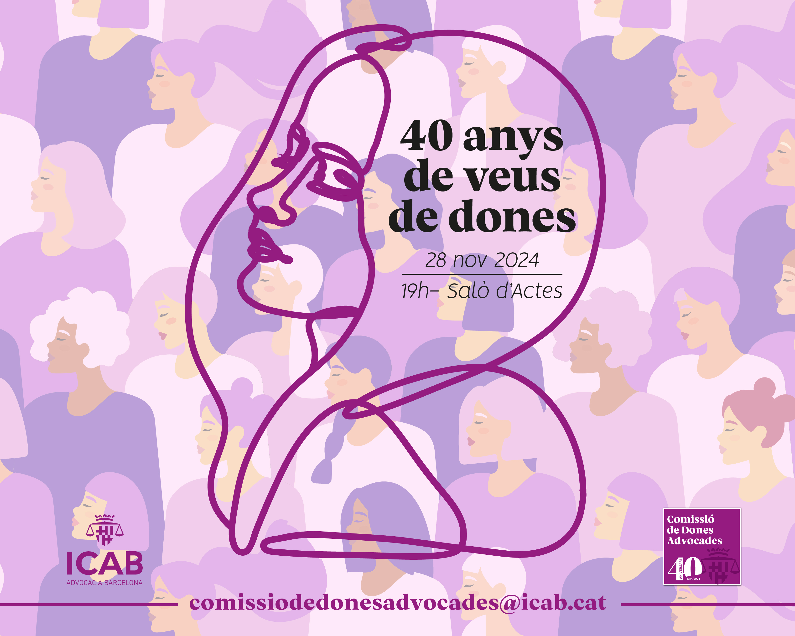 La Comisión de Mujeres Abogadas del Ilustre Colegio de la Abogacía de Barcelona se complace en invitarle a los actos de celebración del 40 aniversario de la creación de la Comisión de Mujeres Abogadas, “40 AÑOS DE VOCES DE MUJERES ”.