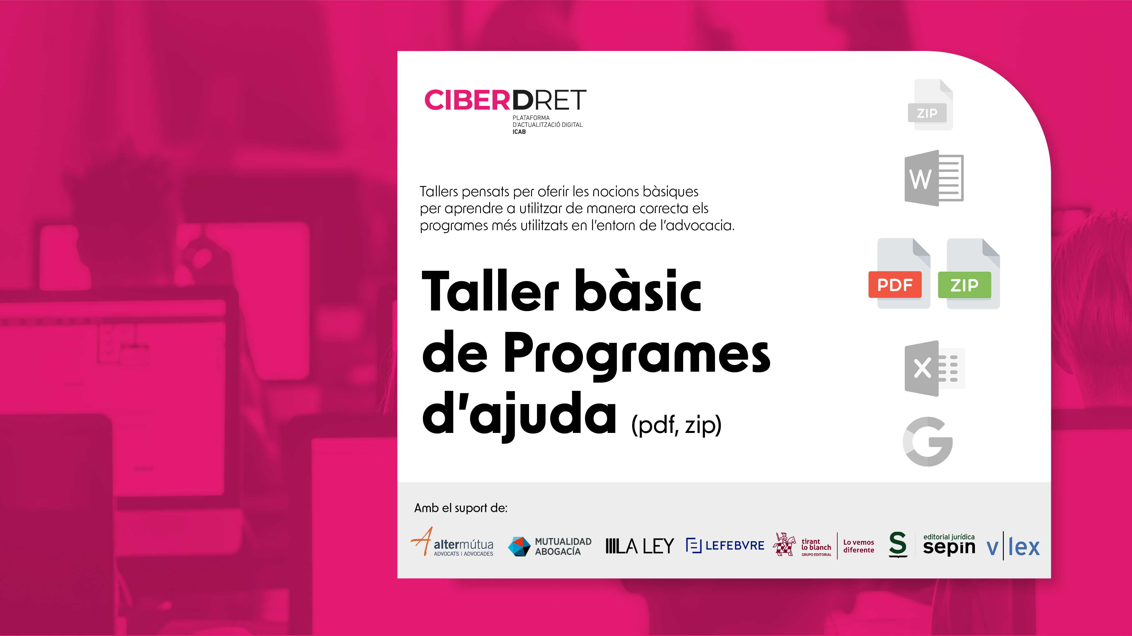Desde CIBERDRET hemos organizado este taller con la finalidad de poder ofrecer a todas las personas colegiadas del Colegio de la Abogacía de Barcelona (ICAB) las herramientas para aprender a usar de una forma eficiente los programas de ayuda necesarios para llevar a cabo sus labores profesionales. La duración es de 2 sesiones que se impartirán los días 15 y 22 de septiembre de 2023.