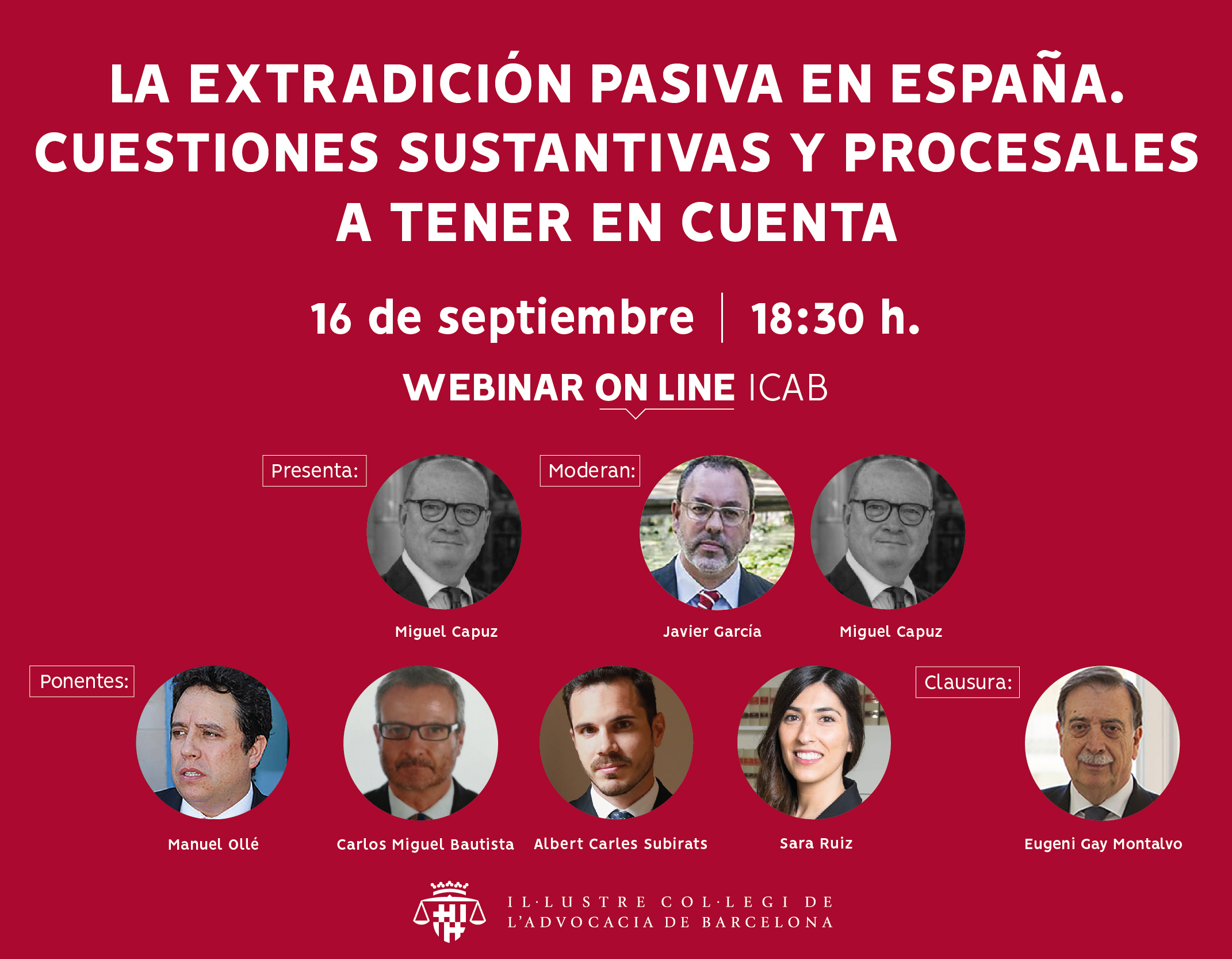 Albert Carles Subirats: Abogado experto en Derecho Penal Internacional. Profesor colaborador de Derecho Penal Internacional (ISDE). Diputado de la Junta de Gobierno del ICAB responsable de la Comisión de Justicia Penal Internacional y Derechos Humanos. - "Plazos y prisión a efectos de materialización de entrega extradicional"