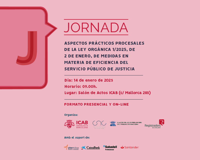 14 de enero de 2025, a las 9h, presencial y on-line. Organizada por el Ilustre Colegio de la Abogacía de Barcelona, Ilustre Colegio de Procuradores de Barcelona, Colegio Notarial de Cataluña y los Registradores de Cataluña