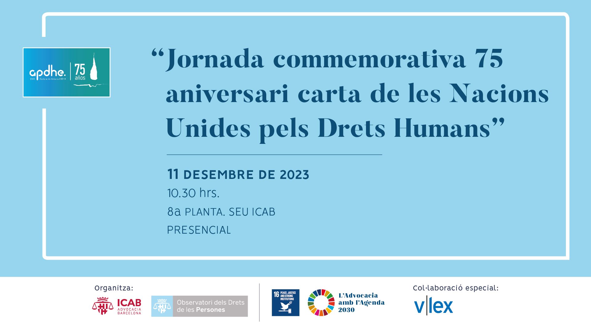 Con la colaboración especial de Vlex. Durante el acto se presentará el informe "LA DECLARACIÓN UNIVERSAL DE DERECHOS HUMANOS EN ESPAÑA", de la Asociación pro DDHH de España (APDHE).