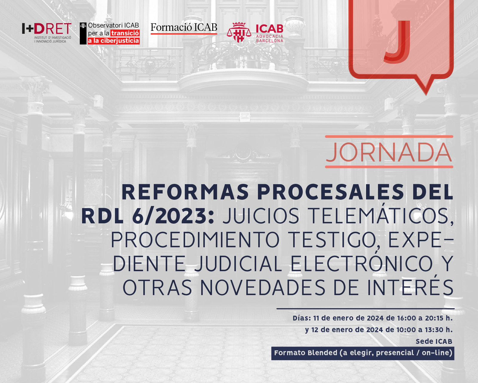 Jueves 11 y viernes 12 de enero de 2024 en la sede del ICAB. Formato blended (a elegir, presencial / on-line)
