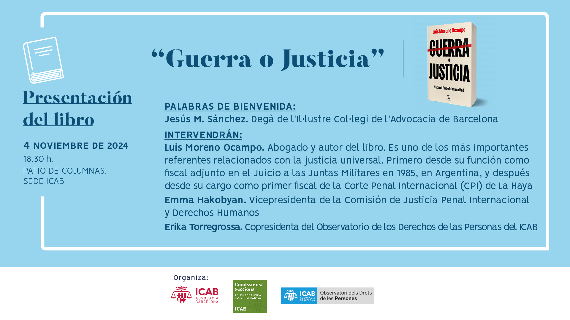 El día 4 de noviembre de 2024, a las 18.30h en el Patio de Columnas, tendrá lugar la presentación del libro "Guerra o Justicia", de Luis Moreno Ocampo. Organiza: Comisión de Justicia Penal Internacional y Derechos Humanos y Observatorio de los Derechos de las Personas del ICAB.