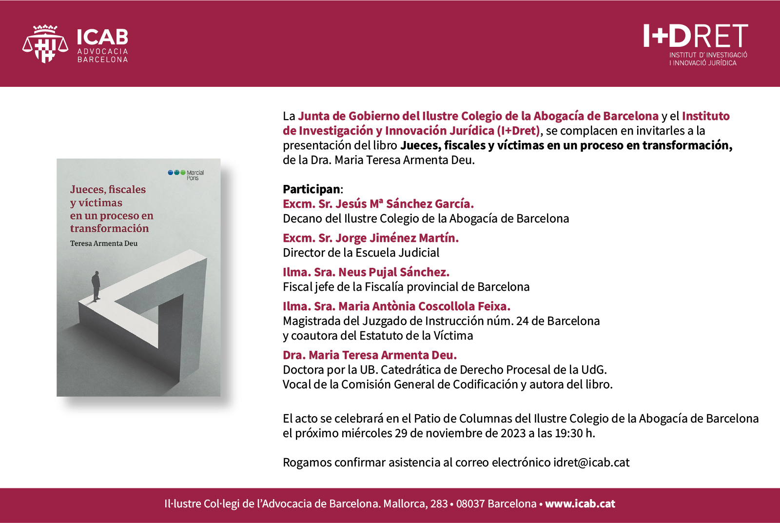 Se ruega confirmación de asistencia al correo electrónico idret@icab.cat